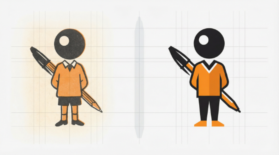 Look at the image above. BIC is a pen brand. The mascot of BIC, known as the BIC Boy, was introduced in the 1960s. It features a simple little boy with a round head resembling a pen ball and originally included many details. However, the later version is simplified and becomes flatter and more modern overall.