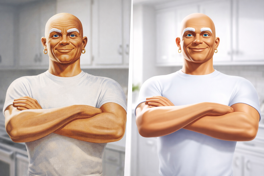 This picture showcases a visual refresh of the Mr. Clean mascot. While the character retains its core attributes, being bald, wearing a white shirt, and having a muscular build, there are notable updates.